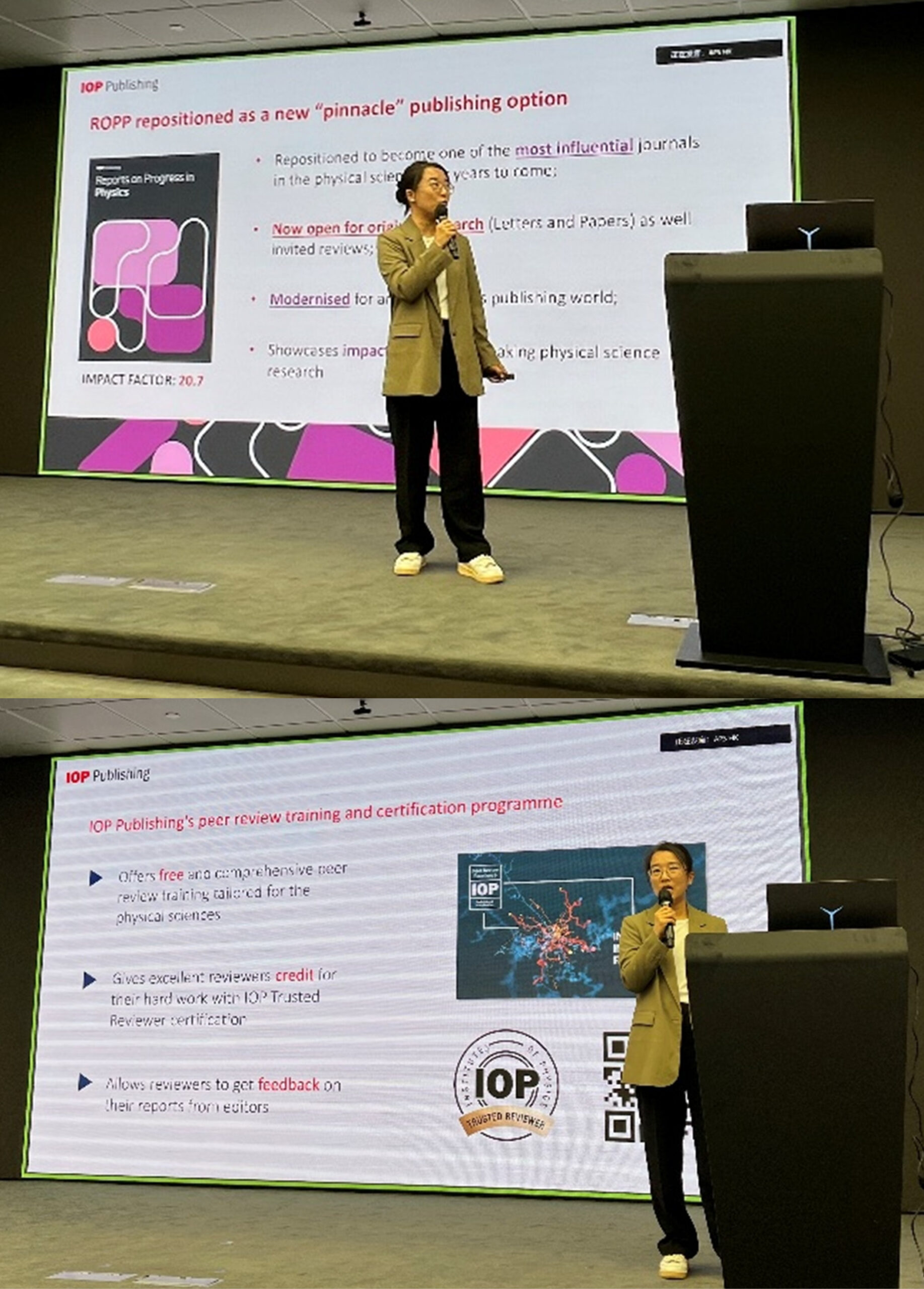 张博士分享了IOP出版社在高质量学术出版、同行评审实践以及期刊发展方面的最新进展,并重点介绍了旗舰期刊Reports on Progress in Physics (ROPP) 等的重要成果。报告展示了学术出版在推动科研成果传播、支持全球物理学社群发展中的关键作用。
